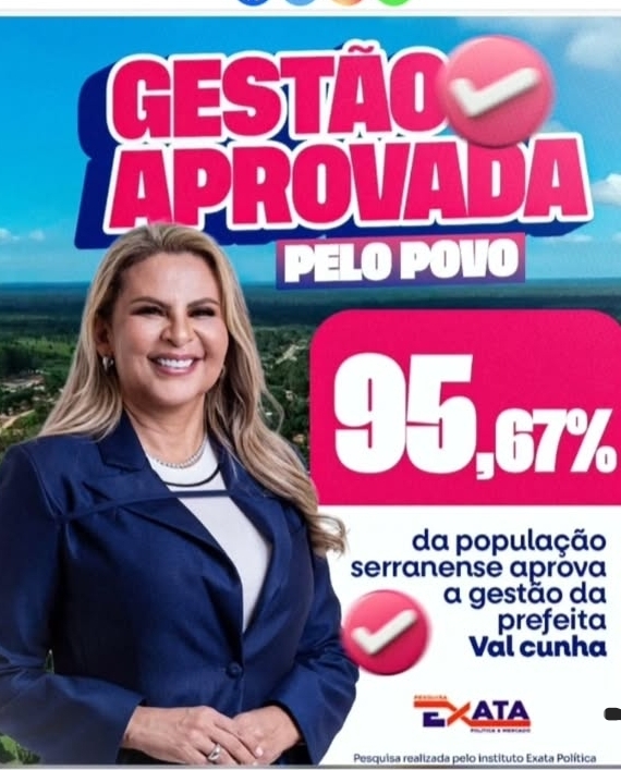 A prefeita Val Cunha alcançou um feito histórico ao registrar 95,67% de aprovação popular, consolidando-se como a gestora municipal com o maior índice de aprovação do Brasil. O resultado reflete o reconhecimento da população serranense ao trabalho desenvolvido pela atual administração, marcado por investimentos estruturantes e políticas públicas voltadas à melhoria da qualidade de vida.